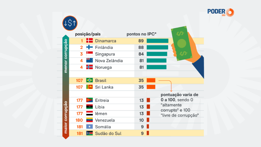 O Brasil ficou em 107º lugar no ranking global de percepção da corrupção de 2025, divulgado nesta 3ª feira (10.fev.2026). O levantamento foi produzido pela ONG alemã Transparência Internacional e avalia 182 países. O Brasil manteve a mesma posição de 2024, que é a pior desde que passou a ser analisado, em 2012.