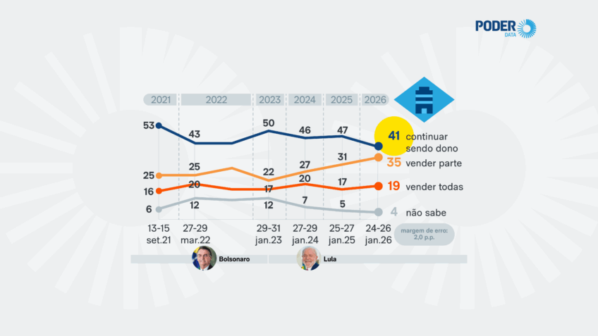 Outra parte do eleitorado (41%) defende que o governo “continue dono” das empresas. É o menor patamar registrado pelo levantamento. Caiu 6 pontos percentuais em 1 ano. Quando o presidente Luiz Inácio Lula da Silva (PT) assumiu o 3º mandato, defendendo o fim das privatizações, essa taxa estava em 50%. Os dados são de pesquisa PoderData feita de 24 a 26 de janeiro de 2026.