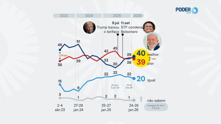 Segundo levantamento do PoderData realizado de 24 a 26 de janeiro, o governo do presidente Luiz Inácio Lula da Silva (PT), 80 anos, é considerado “melhor” do que o do ex-presidente Jair Bolsonaro (PL), 70 anos, por 40% dos brasileiros. Em contrapartida, 39% dos eleitores afirmam preferir a gestão do ex-chefe do Executivo. Outros 20% dizem não ver diferença entre as administrações.