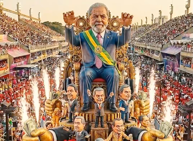 A paródia de Zema tem carros alegóricos que mostram Lula preparando picanhas, uma construção que simula a sede do Banco Master, uma ala com críticas à gestão da Petrobras e uma alegoria sobre “fraude no INSS”.